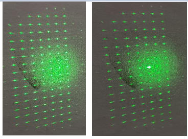 例如我们使用x13138的SLM,SLM像素大小是12.5um,透镜焦距是125mm,激光器波长是800nm,则最大加工尺寸是8mm,因而如果HPK目标图像分辨率是128*128的话,则点与点之间最近距离是8mm/128=62.5um,远大于每个亮点的本身大小,所以看到点阵。而如果HPK目标分辨率是1024*1024的话,则点与点之间最近距离是8um/1024=7.8125um,小于每个点的大小,因而无法看出来是点阵,而是连在一起。
