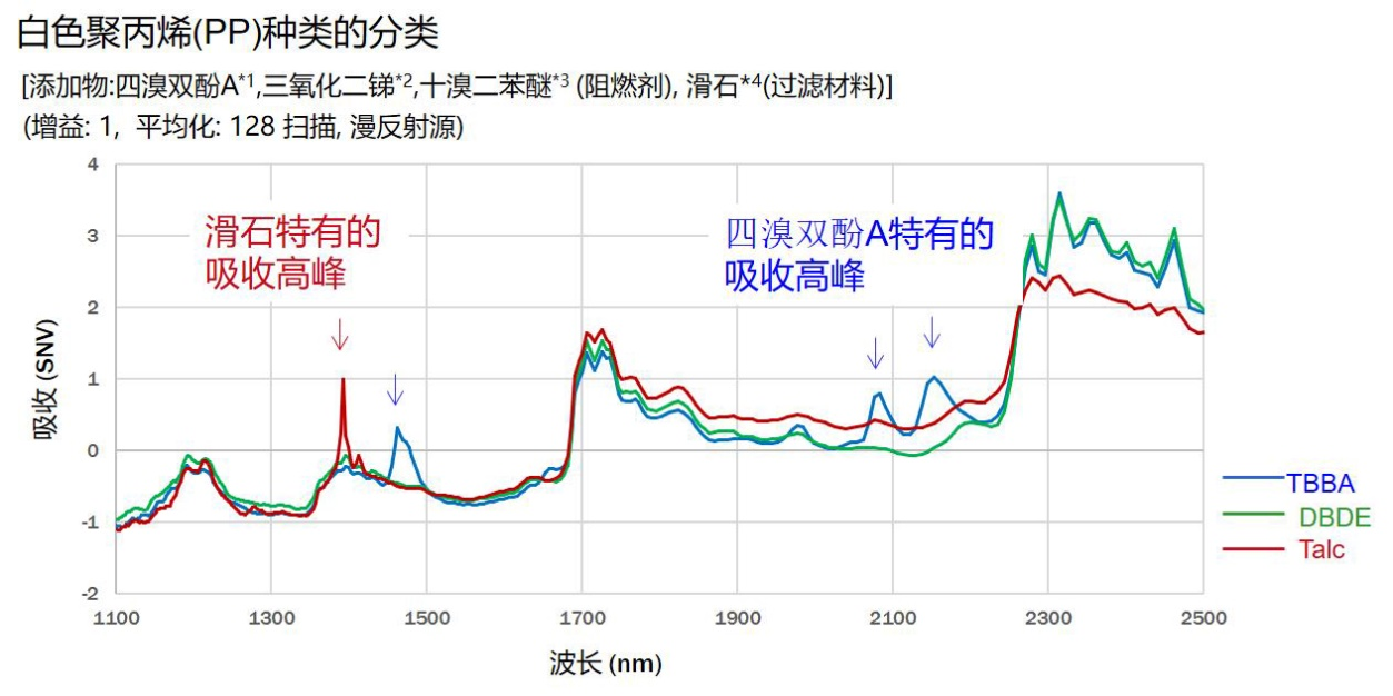 从抽测的三种样品的光谱曲线中可以看到(上图),TBBA和滑石都有各自的特征吸收峰。对比之下也,则可以把含有DBDE成分的样品区分出来。