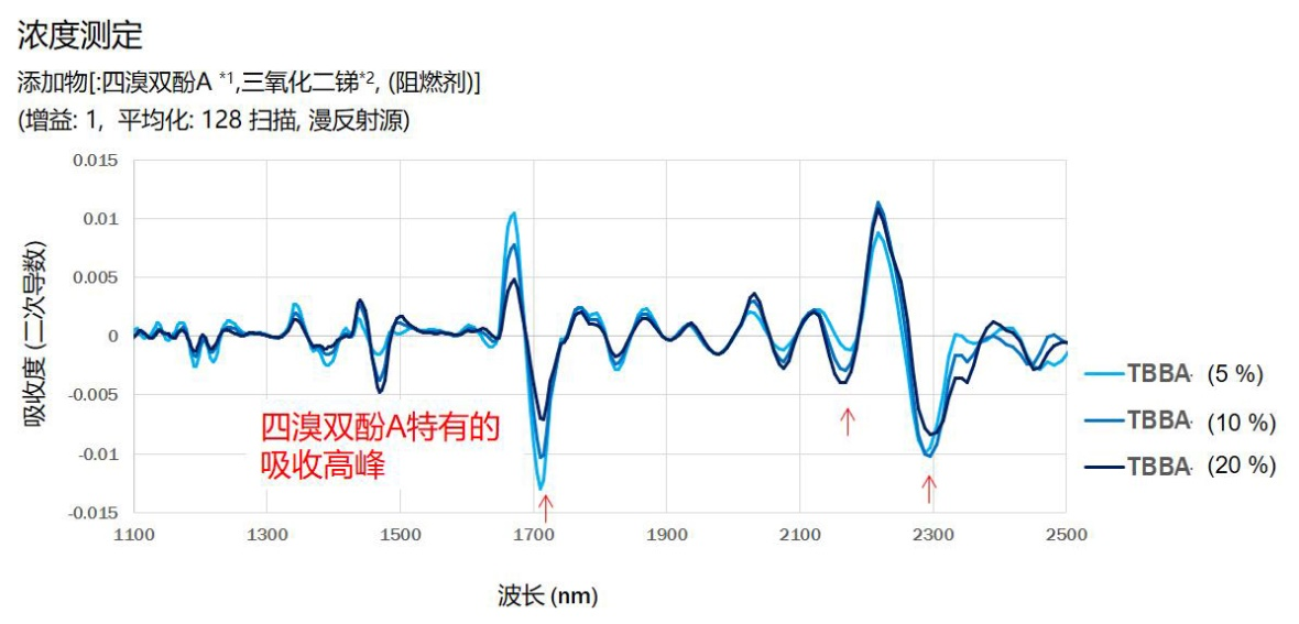 更进一步来看,我们甚至可以通过TBBA的吸收特征,来实现定量检测。这可能会在一些高精度的塑料检测中有所应用。以下我们也可以看到抽测了另外3种含有不同浓度TBBA样品的数据。