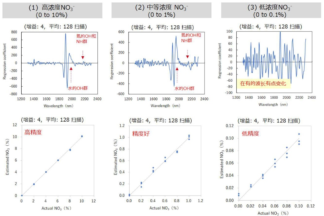 而低浓度的情况下,没有明显的吸收高峰,需要使用整个波长范围内的数据来获得校准曲线。而C15511-01即使在低浓度的情况下,也可以获得基本正确的定量效果,信噪比表现是较为优秀的。