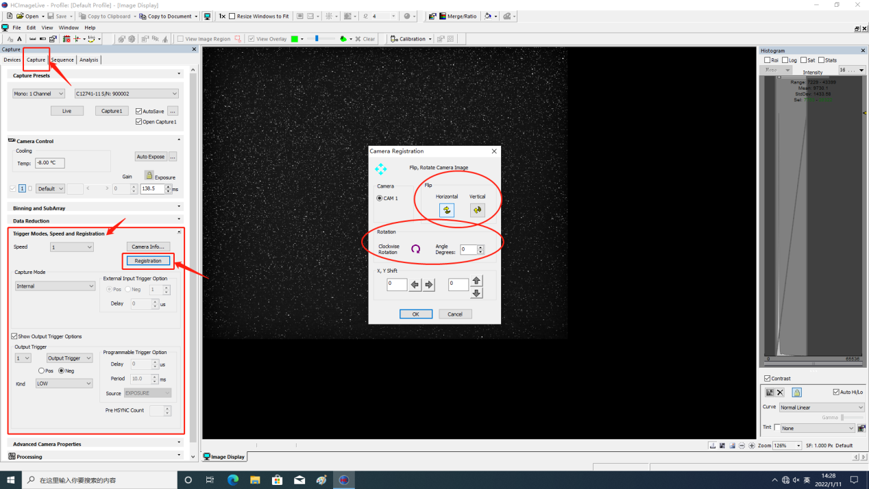 我们的操作软件是可以实现的。在软件Capture pane下面,trigger mode, speed and registration这里,点registration, 弹出来的窗口设置旋转和翻转。
