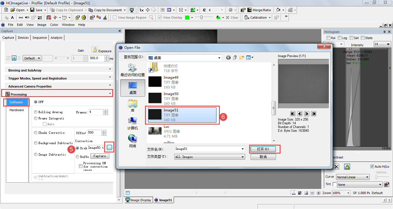 在Capture pane-Processing-Software下,选中Disk;点击Disk后的按钮,选择刚才保存的背景图像,打开。