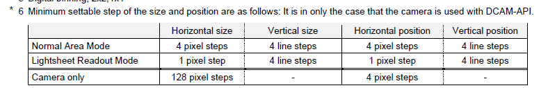 Normal Area Mode模式是4x4,详见Instruction manual文件。如果在软件HCImageLive中ROI自定义数值中输入小于4的值,会自动变为4。