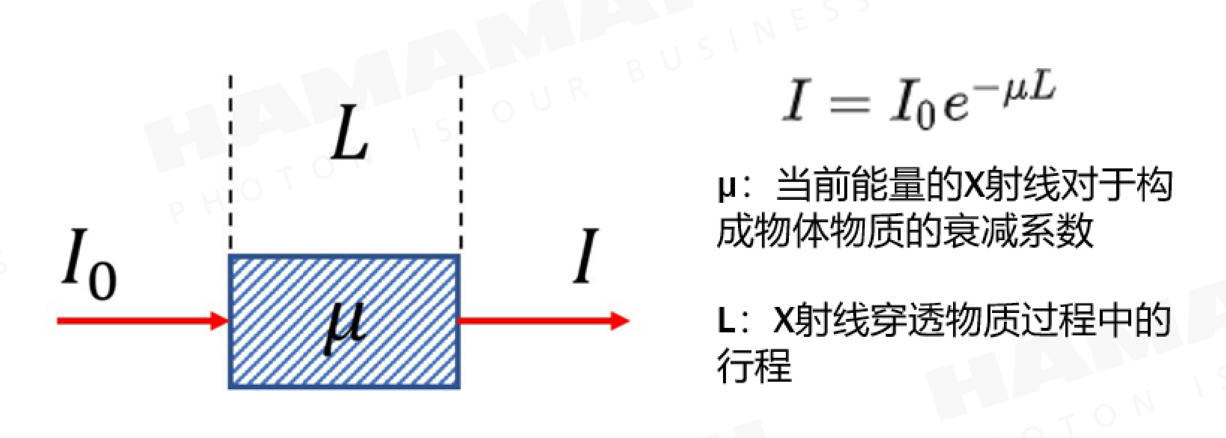 当X射线穿过物体时,其强度会随着穿透距离的增加而衰减,衰减的剧烈程度又和组成物体的材料成分相关。假设X射线穿透单一成分的物体,在进入物体前其强度为I0,穿过一段距离L后,X射线的强度I变为: