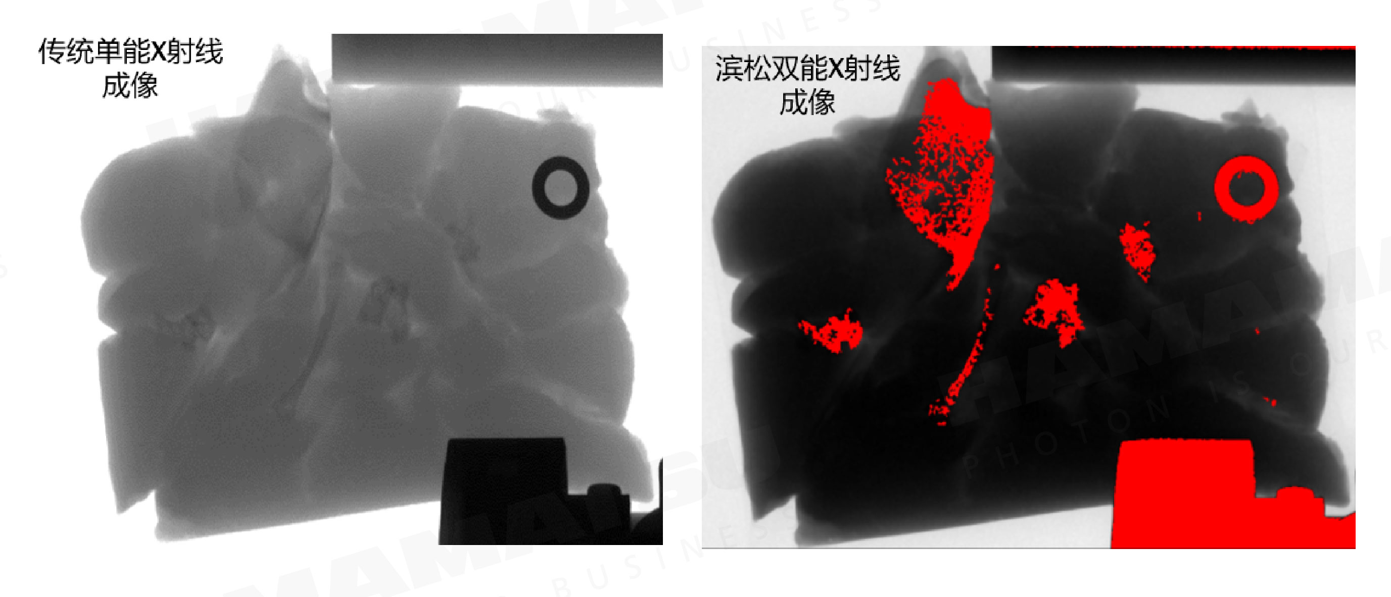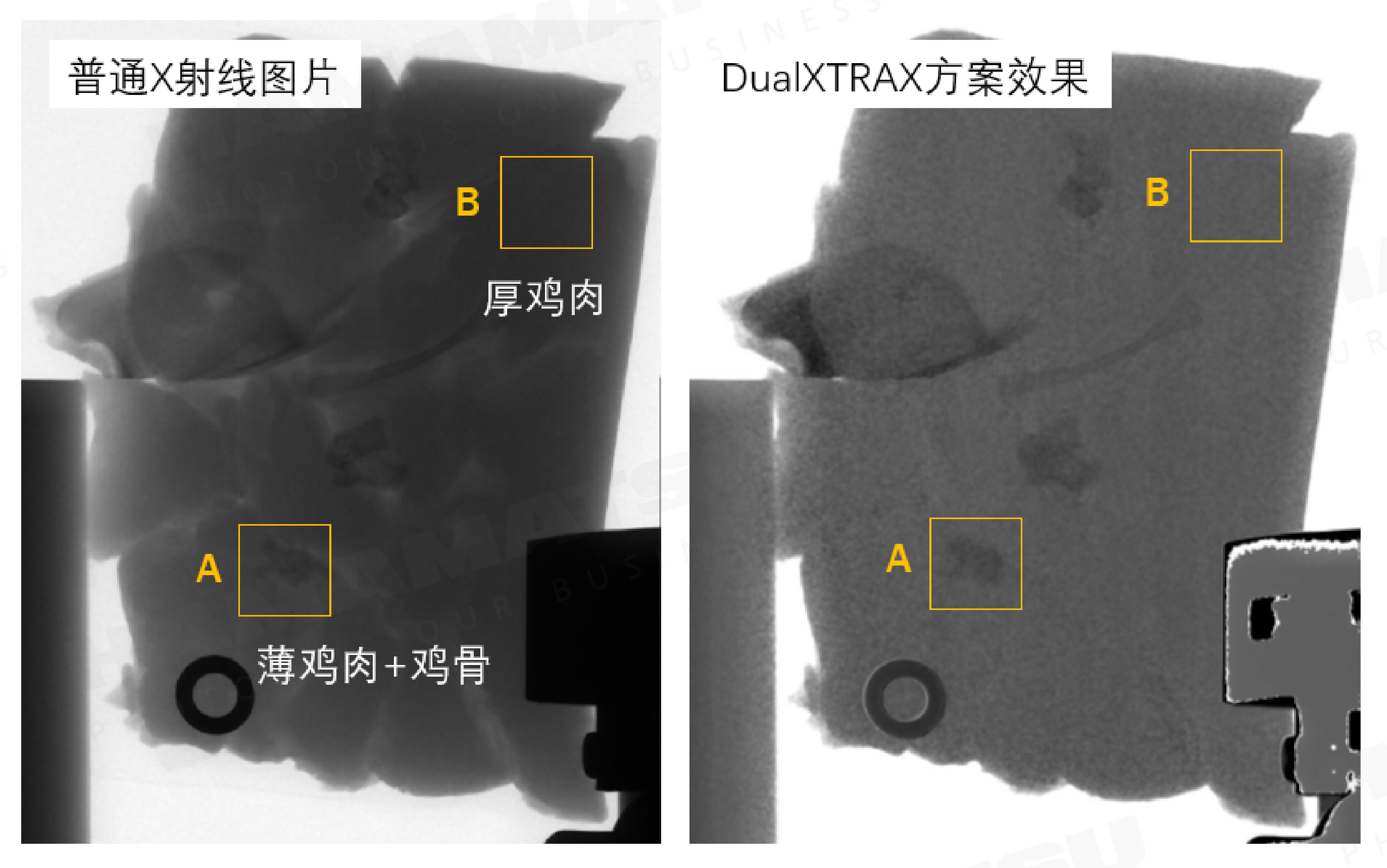 图3 鸡肉+鸡骨头样品中,普通X射线成像和滨松DualXTRAL成像效果对比图