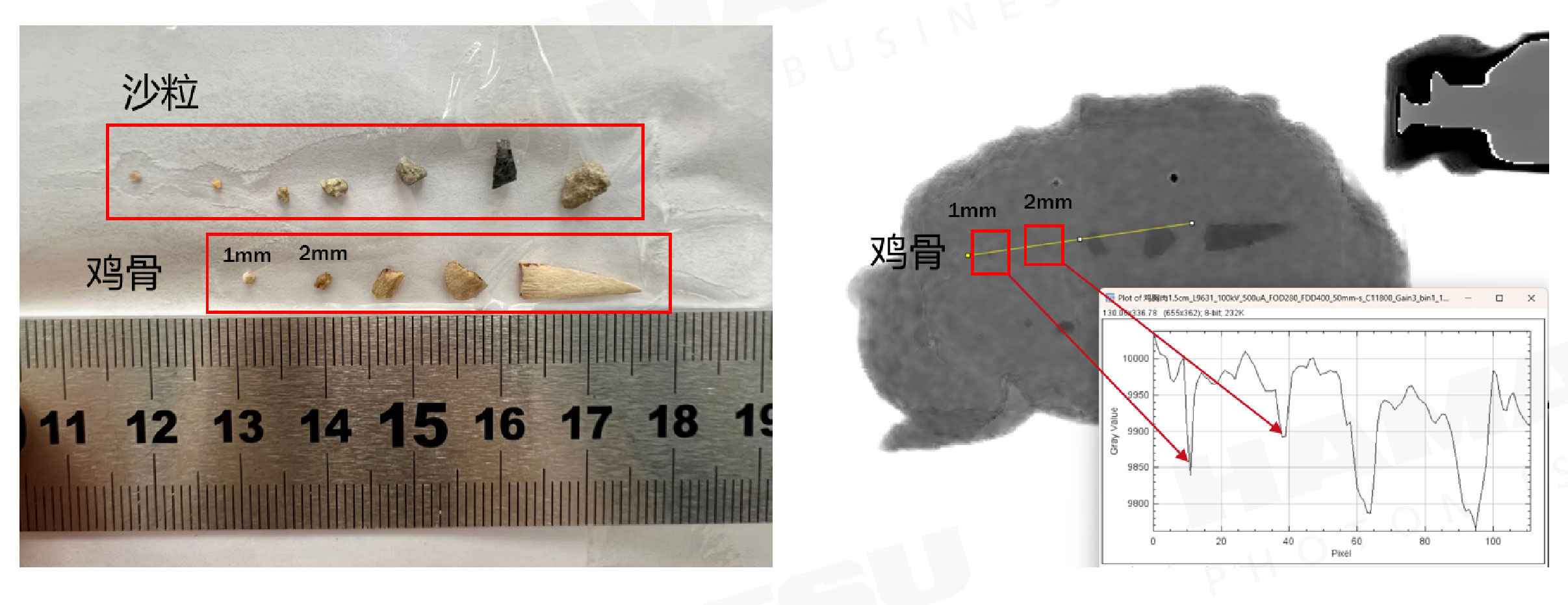 在本案例中,鸡肉当中混合了大小从1 mm-5 mm不等,厚度为1 mm左右的鸡骨碎屑,在最终成像的图像中选取一段线形ROI,如右图,绘制黄色线段区域的灰度值曲线,可以看到有明显的灰度值下降,可以以此为依据识别1-2 mm的鸡骨。