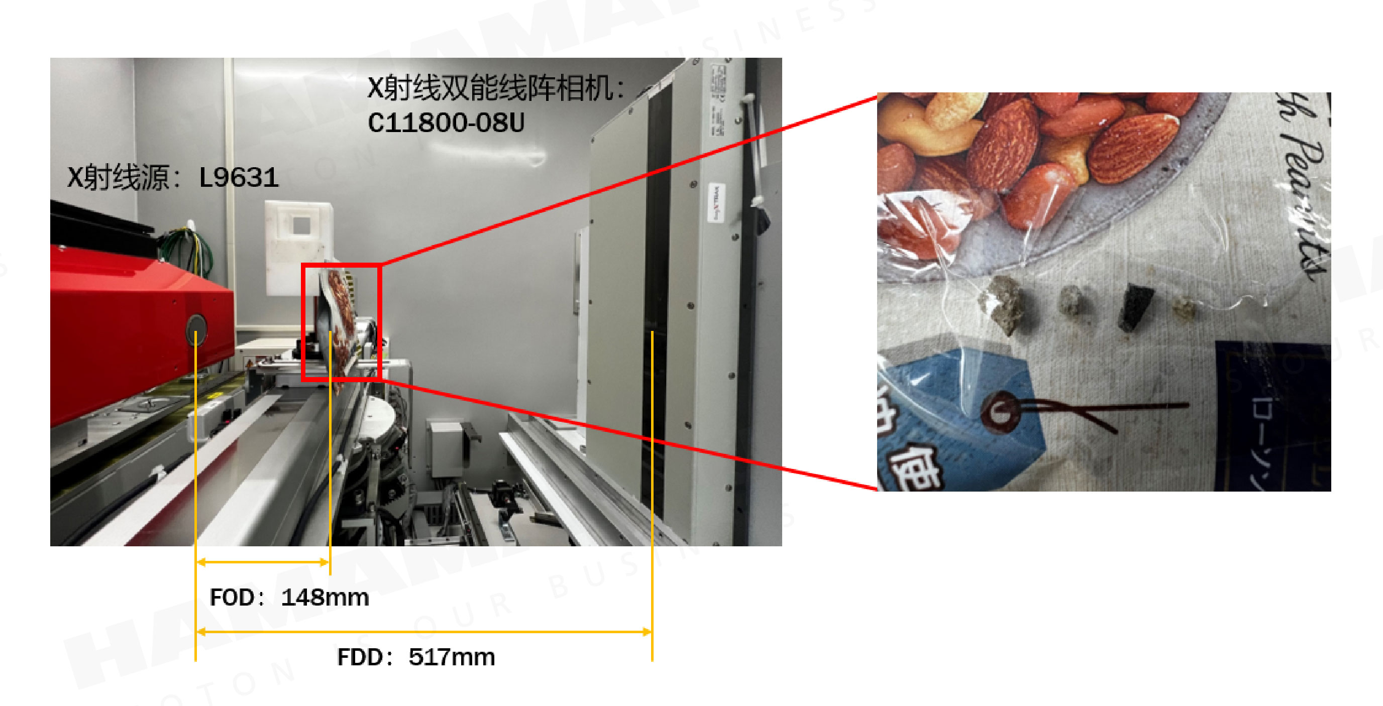 在滨松中国的实验室中,我们已经采用滨松DualXTRAX方案,成功实现了高分辨率(1 mm)、高速(最快100 m/min)、精准的异物检测。案例展示如图。