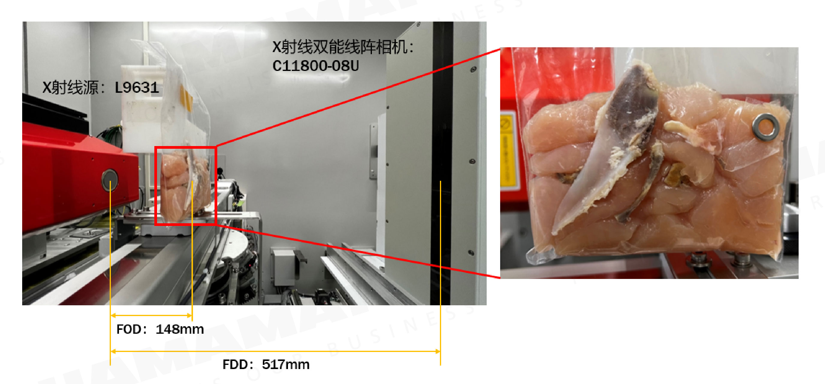 滨松双能X射线线阵扫描相机C11800系列采用双层传感器,可以同时分别响应X射线当中的低能部分和高能部分,获得了两个能量X射线的穿透图像信息。再结合与硬件设计(如闪烁体厚度所导致的高低能能谱具体参数)对应的算法,可以消除物体厚度对灰度值的影响,最终得到的图像中,物体内部不同成分所对应的灰度值就不一样了(如图3右),完全排除了样品厚度(图1中的L,图3中鸡肉的薄厚)对成像效果的影响。