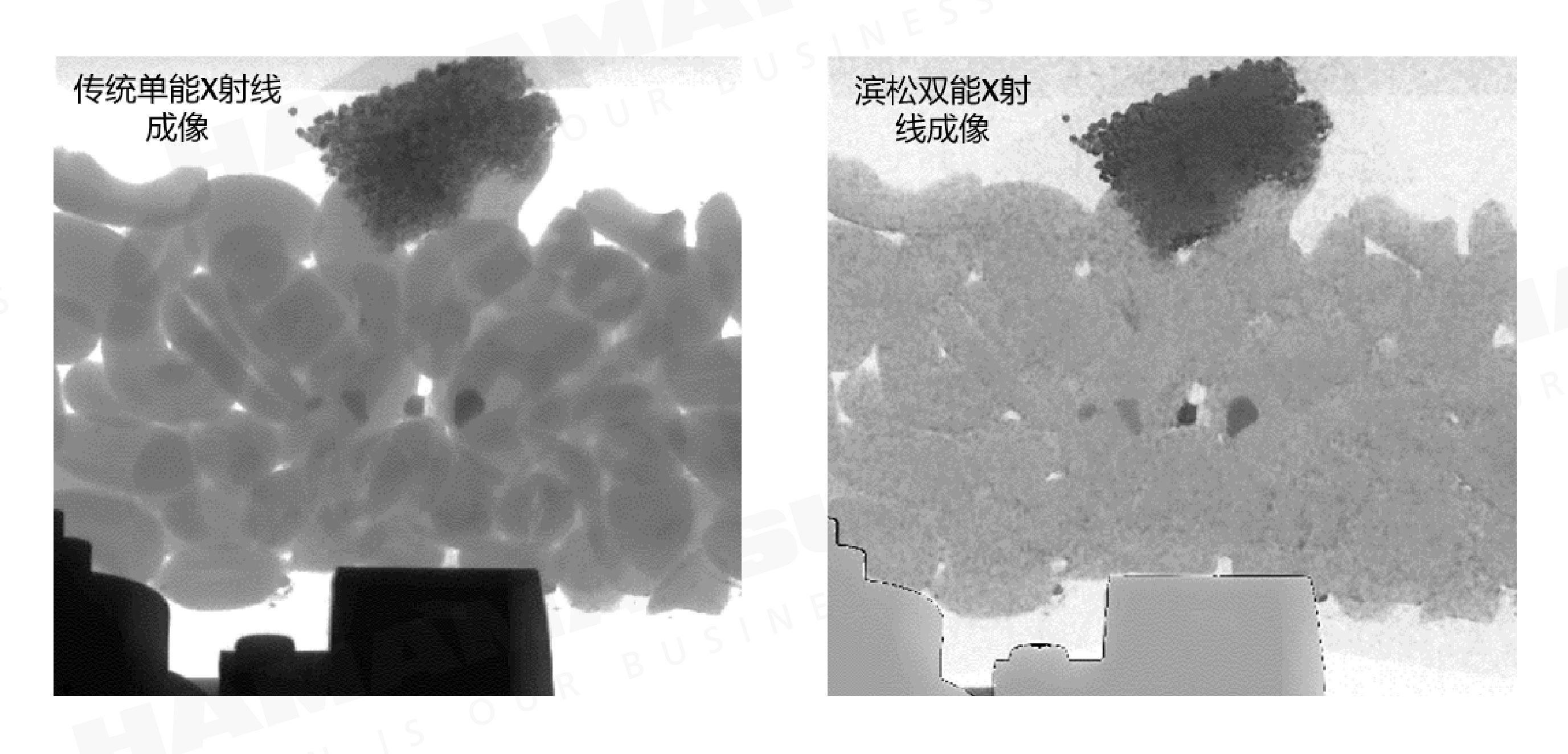 在本案例中,直径大约2 mm-5 mm的沙粒混在坚果中,由于坚果之间有非常多的重叠,在单能X射线成像中,坚果部分的灰度值起伏非常剧烈,因此无法有效地从图像中分离出沙粒。但是在滨松DualXTRAX成像方案中,经过双能相机采集和算法处理,由于坚果厚度造成的图像灰度值区别被消除,沙粒因此很容易地被检测出来。