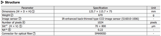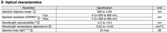 分辨率:光谱仪能分辨相邻光谱峰的能力。取决于狭缝宽度、图像传感器像素尺寸、光栅刻线密度、光栅焦距等,不同波长有所不同(滨松datasheet中的值一般是最差情况)。光谱仪的分辨率表征可以测量最窄的光谱,滨松使用FWHM( full width at half maximum )定义:通过测量极窄的线光谱进行测试,对结果首先进行高斯拟合,然后测量得到FWHM。
