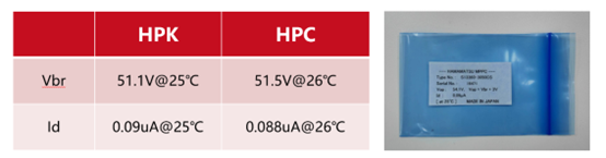 MPPC在出厂前会提供几个数据,如推荐工作电压Vop,击穿电压Vbr,以及暗电流Id如图: