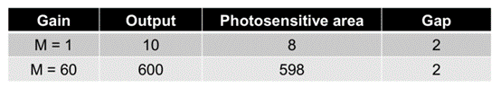 因此,如果使用标签上 (M = 60)的电压 VR,并且光仅入射到感光面内探测,增益将大于60。