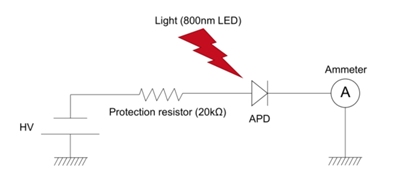 从这张图可以知道,当反向电压为0时,APD的增益为1,也就是和PD一样,并未发生雪崩,此时输出信号为IO;在相同的光强下,随着电压的增加,增益增加,输出信号IP有所增加,增益计算如下:M= IP / IO 。