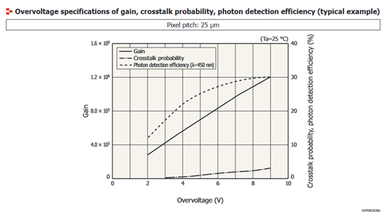 MPPC特性随工作电压的变化而变化。增加工作电压虽然提高了增益,光子探测效率和时间分辨率,但同时也增加了暗计数和串扰,因此必须选择最佳的工作电压来匹配应用。