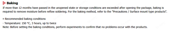 ① 如果在未开封状态下超过3个月或开封后超过储存条件,则需要烘烤以去除水分,然后再回流焊接。