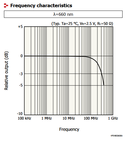 测试条件:入射光波长660 nm,温度25 ℃,反向电压2.5 V,负载电阻50Ω的条件下测试频率特性。