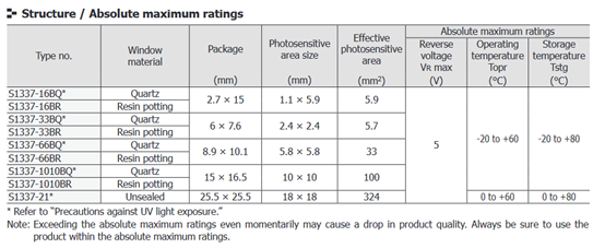 当应用紫外线照射时,产品特性可能会退化。包括产品的UV敏感性的降低和暗电流的增加。UV光暴露会由于粘接产品组份材料的树脂释放的气体而导致特性降解。因此,我们建议您避免将紫外线直接照射在树脂上,而只使用光阑或类似的方法将紫外线照射在感光区域的内部。