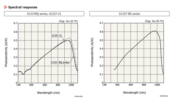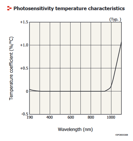在正常工作温度范围内,Si PD在可见光波段的灵敏度基本不随温度而改变。以S1337为例,300 nm~900 nm波段温度系数变化百分比非常之小,可以认为基本没有影响。在900 nm之后,光灵敏度受温度影响,如果测量的是长波段,1100 nm下,温度每升高一度,灵敏度变大1.1%左右。1040 nm下,温度每升高一度,灵敏度变大0.5%左右。