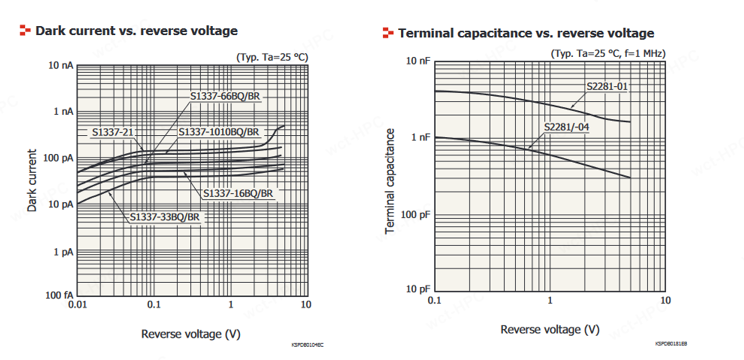 左图为在25℃下,暗电流随反向电压的变化,右图为在25℃下,终端电容随反向电压的变化。通常暗电流随反向电压的增加而增加,随面积的增加而增加,终端电容随反向电压的增加而降低,随面积的增加而增加,增加反向电压可以提高线性上限,降低终端电容,提高响应速度,但暗电流会增加。