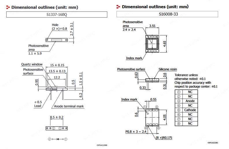 Anode terminal mark,阳极端子标记,滨松手册通常都有一个比较细节的阳极标识或①脚标识,有的型号可能需要仔细观察。如左上所示,②号引脚为阴极,①号引脚为阳极。