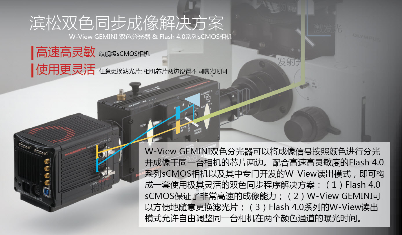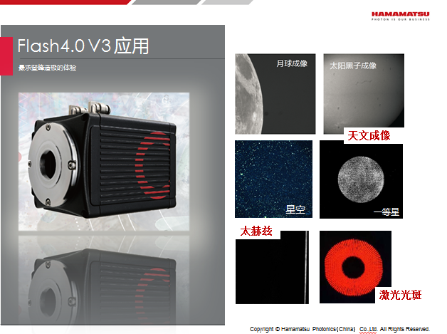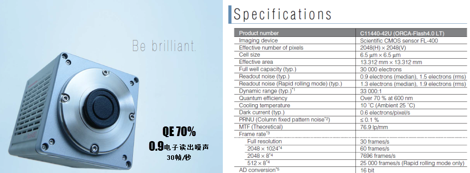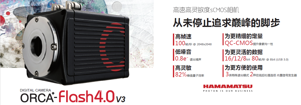 sCMOS相机的旗舰产品就是 Flash4.0 V3, 这是一款高速高灵敏度的相机,在2048×2048全分辨率下可以达到100帧/秒的高帧速,并且能看到低至2~3个光子/像素/秒的极弱信号。 点击查看中文彩页