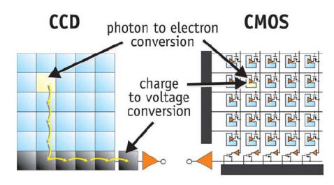 这一类相机的芯片由硅材料制成,主要分为CCD和CMOS两大类。他们的主要区别是读出方式的不同。相机成像——从光子到数字化图片的过程——主要分为三个步骤:光子到电子的转化、电子到电压的转化、模数转换,而CCD和CMOS的区别就在于从电子到电压的转换过程中,CCD是像素统一读出的,而CMOS是每个像素单独读出的。这一区别也决定了CCD相机和CMOS相机各自的优劣。在过去,由于CCD相机的像素一致性好,占据了大部分高端市场;近年来,CMOS芯片技术已取得巨大进步,在多方面已超越CCD。凭借高速度(帧速率)、高分辨率(像素数)、低功耗以及最新改良的噪指数、量子效率及色彩观念等各方面优势,CMOS芯片逐渐在CCD芯片主导的领域里占据了一席之地。