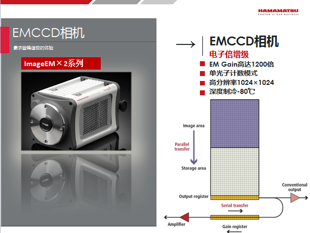 对于单光子等极其微弱的光来说,有一种特殊的CCD相机,叫做电子倍增(EM)CCD相机,这类相机与普通CCD不同之处在于其在读出时,有一个电子倍增的过程,将弱信号进行放大,所以可以捕捉到像单光子这样的弱光。但是在电子倍增的同时,和电子一起产生的部分噪声也同时被放大,因此仅限于4光子以下的极弱光使用。滨松型号有 C9100-23B, C9100-24B。