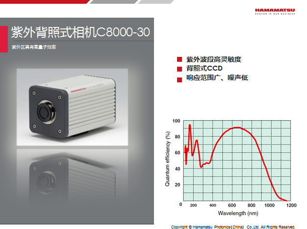 CCD的芯片可以在紫外部分进行量子效率增强,以观察紫外波段,用于极紫外光刻、自适应光学等应用;紫外相机的CCD芯片通常都是背照式的,以提高芯片的灵敏度,型号有 C8000-30, ORCA II。