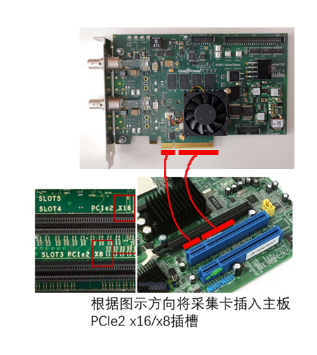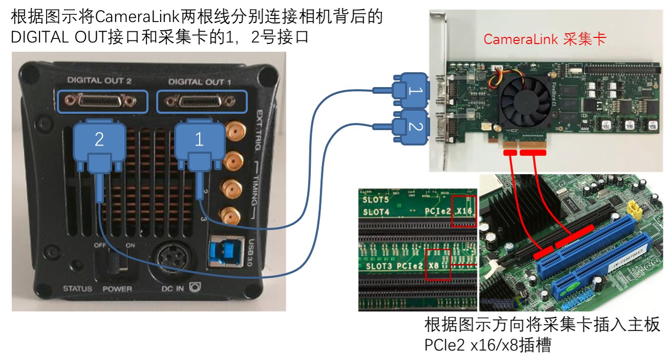 针对使用CameraLink数据接口的相机,需要准备好两根CameraLink线缆和一张CameraLink采集卡。使用时,按照下图所示的连接方法,将采集卡插入主板上合适的插槽,再连接两根线缆到相机背后的接口上即可。