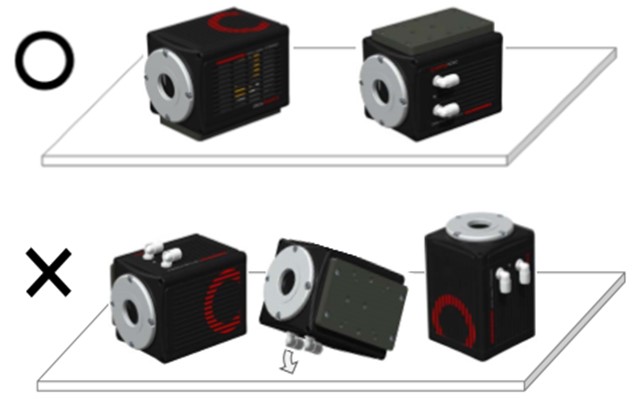 相机在整合到成像系统时,需要注意避免通风散热口被阻挡。正确的操作是将相机保持进光口水平的摆放状态时,请使相机有水冷管的一面朝向侧面。