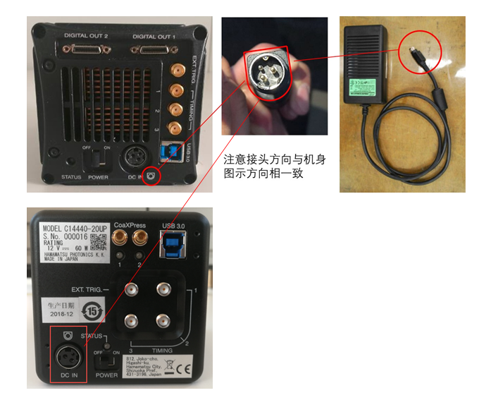 根据图示方向将电源适配器接头与相机背后的"DC IN"接口相连,电源适配器正常用国标电源线连接供电即可。