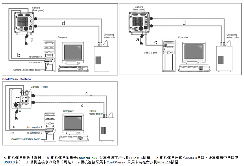 相机根据其具体配置会有不同的数据传输接口,常见的有CameraLink高速传输接口,USB3.0传输接口,CoaXPress高速传输接口。通过下面的两个示意图,我们也能够清晰的看出两者之间连接方式的细微差异。